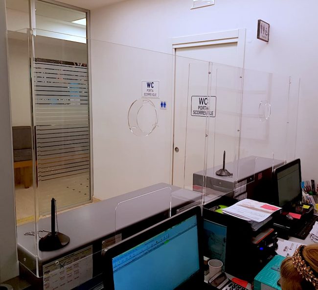 Paraschizzi, parafiato, parasputo Protezione dal contatto con il pubblico con schermi protettivi in plexiglass. Realizzazioni su progetto con misurazioni prese in sede Montaggio in sede dei nostri tecnici
